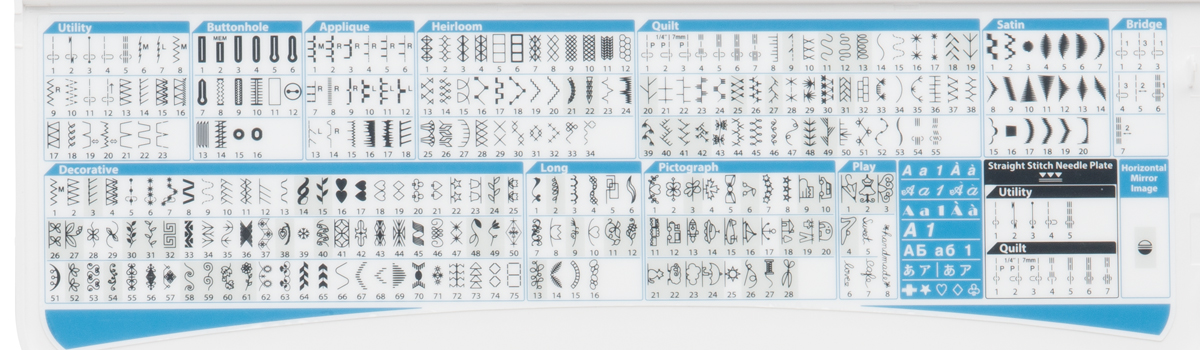 1389 šicích programů: stehy základní, elastické (strečové), overlockové, plastické, quiltovací, vyšívání monogramů - písmen.