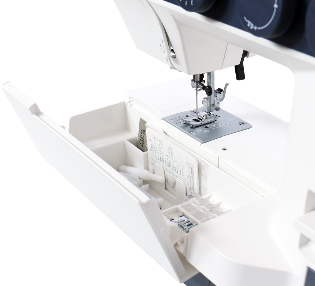 Stroj Janome 1522 má něco, co u žádného jiného šicího stroje (v této cenové skupině) nenajdete, tj. velký a velmi pohodlný pracovní prostor. Co zde máme přesně na mysli? Velikost desky stolu měřená naplocho u stroje Janome 1522 je 105,4 mm x 111,8 mm. Pro srovnání, Janome Juno E1015 (jedná se o stroj standardní velikosti) má desku stolu o rozměrech 66,9 mm x 54,8 mm. Rozdíl je velmi velký. Žádný jiný šicí stroj nemá tak velkou, rovnou pracovní desku, a tedy tolik pohodlí při šití. Využití tak velkého pracovního prostoru ve stroji Janome 1522 má další plus, tj. velmi velký a pohodlný úložný prostor pro příslušenství, který je umístěn ve výše zmíněné desce stolu.
