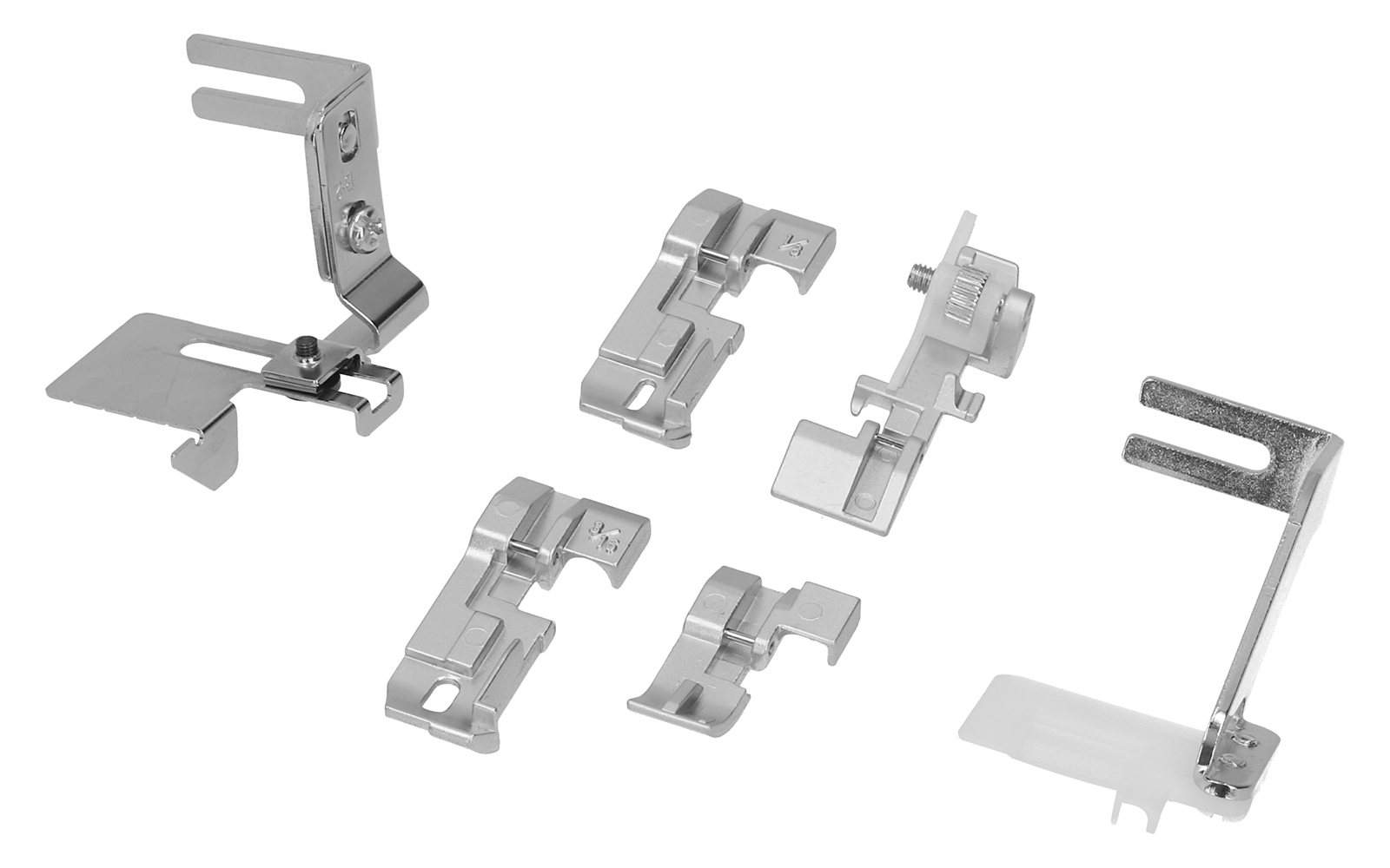 Společně se strojem získáte jedinečný set patek: patka pro slepý steh, patku pro našívání korálků, patky pro kedrování (1/8", 3/16") a vodič.