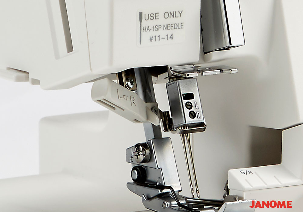 Janome je první! Se zabudovaným navlékačem jehel, jednoduše v jednom kroku navléknete jehly v jednom momentu. Navléknete obě jehly jak levou, tak pravou a můžete ihned šít.